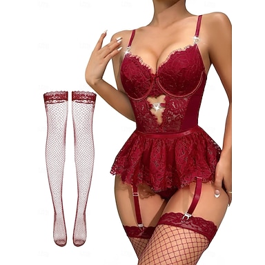 Conjunto de Lingerie Babydoll Bodysuit Meias-calças de Rede com Acessórios Roupas de Noite Nasty Fancy para Adultos Roupas de Festa de Ano Novo Presente de Dia dos Namorados para Ela