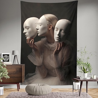 Tapeçaria de parede surreal com máscara de identidade, mulher segurando rostos, estética sombria e melancólica, decoração gótica única para quarto, sala de estar, estúdio, fundo de arte, retrato de