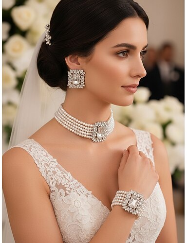 Conjunto de Jóias 3pçs Strass Liga Brincos Colares Mulheres Elegante Vintage Guloseima Geométrico Forma Geométrica Conjunto de jóias Para Casamento Festa Convidado do casamento