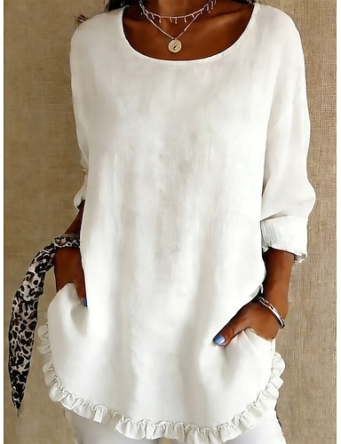Mulheres Camisa Social Blusa Linho de algodão sintético Camisa com babados Frufru Tecido à moda Clássico Moderno Manga Longa Gola Redonda Tops regulares Diário Feriado Para Noite Preto Branco Amarelo