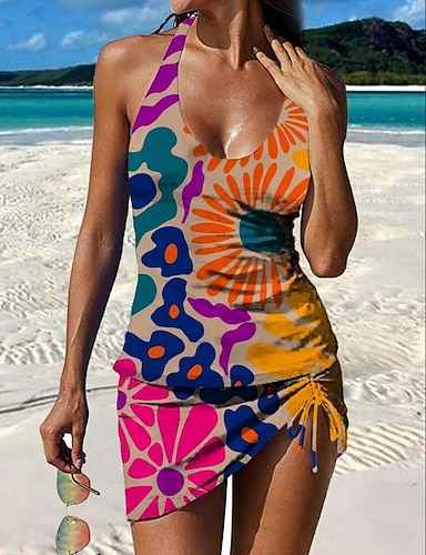 Maiô Feminino Boho Saia Elegante para Férias Gráfico Floral Sem Mangas