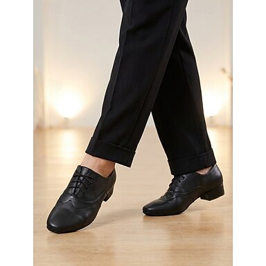Sapatos de dança de salão masculinos pretos, com cadarço e sola macia, ideais para praticar danças latinas, tango e salsa. &apresentação em recinto fechado