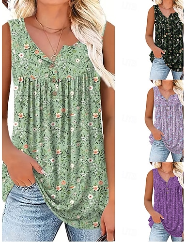 Mulheres Blusa Botões Imprimir Floral Casual Sem Manga Decote V Tops longos Diário Feriado Preto Verde Claro Azul Céu Roxo Claro Roxo Verão Primavera