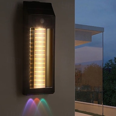 Luminária solar de parede para exterior, ideal para cercas, com acendimento/desligamento automático e luz branca quente. Fácil de instalar, perfeita para casa, jardim, pátio e camping.