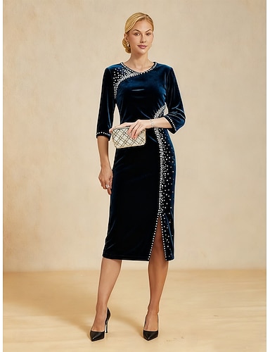 Vestido midi feminino de veludo, modelo justo ao corpo, elegante para festas noturnas, modelagem regular, cor sólida, manga 3/4, decote em V, nas cores vermelho, azul e roxo, ideal para o inverno.