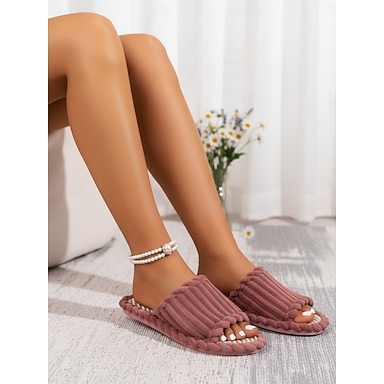 Pantufas femininas vermelhas escuras de verão, com biqueira aberta e tecido felpudo – chinelos macios e respiráveis para usar em casa, no quarto e no dia a dia.