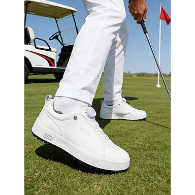 Sapatos de golfe masculinos brancos, em couro sintético macio, confortáveis, com design versátil, perfeitos para golfe e eventos.