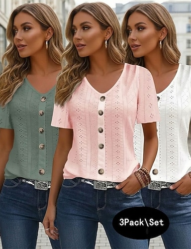 Pacotes múltiplos 3 pecas Mulheres Decote V Manga Curta preto+branco+verde Botões Casual Diário Poliéster Verão