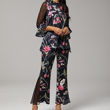 Calças femininas de tecido elástico com estampa floral, chiffon, painéis transparentes, perna larga, cintura elástica, elegante, confortável, trabalho diário, outono