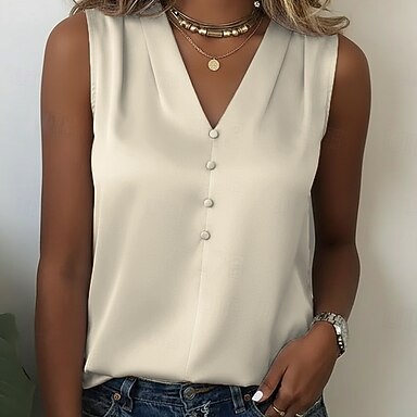 Mulheres Top de cetim Blusa Botões Côr Sólida à moda Básico Casual Sem Manga Decote V Tops regulares Casual Diário Azul Branco Azul Marinha Cáqui Damasco Verão Primavera