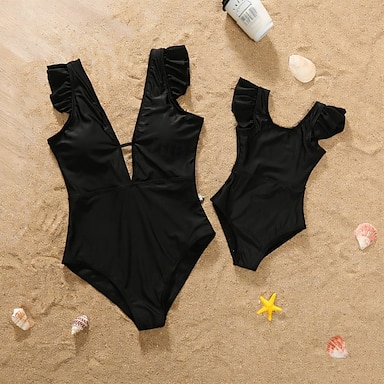 Mamãe e eu roupa de banho Macacão Côr Sólida Casual Franzido Preto Rosa Sem Manga Ativo Roupas Combinando