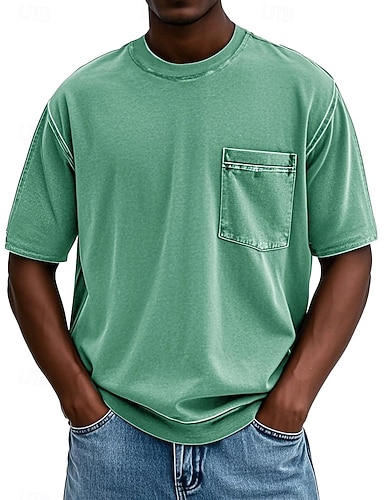 Homens Camiseta Camisa 100% algodão com lavagem ácida T-shirt Manga Curta Gola Redonda Crewneck Verão Primavera Todas as Estações Côr Sólida Vintage Roupa de rua Designer Bolsos Estilo vintage