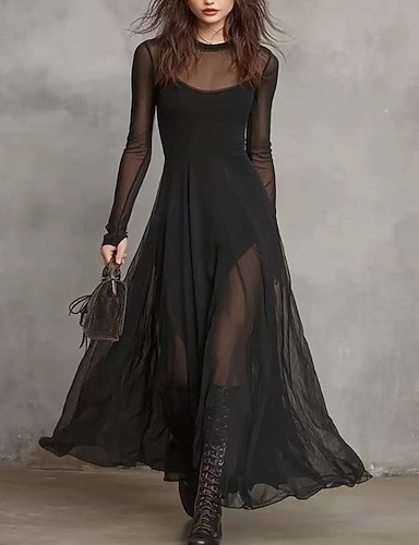 Mulheres Vestido midi Vestidos Para o Verão Vestido da bainha Vestido De Tule Vestido de decote Férias Casual Estilo Praia Diário Praia Festa Delgado Tecido Manga Longa Gola Redonda Preto Outono