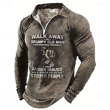 Camiseta Gráfica Masculina Velho Grumpy de Zíper Quarto de Manga Longa - Eu Amo Cachorros Mais do que Humanos Problemas de Raiva e Não Gosto de Pessoas Estúpidas