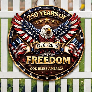 Placa de madeira comemorativa do 250º aniversário dos EUA, decoração patriótica para porta, com a frase "Deus abençoe a América" para o Dia da Independência, com águia, sino da liberdade e Estátua da Liberdade, 1776–2026, decoração para porta de entrada d
