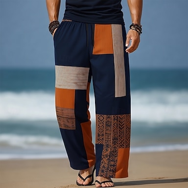 Homens Geométrica Bloco de cor Retalhos Calças Calças largas Calça casual Cintura Média Vintage retrô Casa Ao ar livre Férias Cintura elástica com cordão Calças de linho com bolsos Verão Primavera