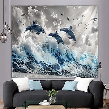Tapeçaria de golfinho com ondas do oceano saltando, arte de parede com golfinho à luz do sol, espuma do mar, natureza e vida selvagem para decoração de sala de ioga e espaço de meditação.