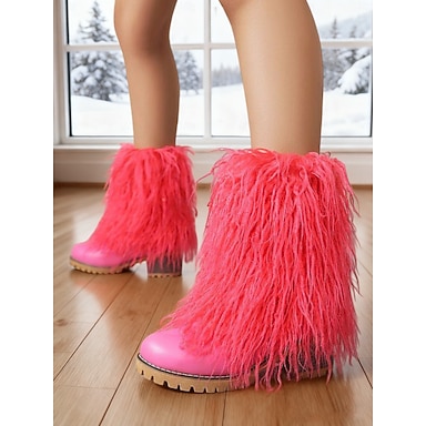 Botas femininas rosa-claro de cano médio com salto alto e forro de pele sintética - botas modernas de salto grosso para o inverno, eventos de fim de ano e festas de Natal.