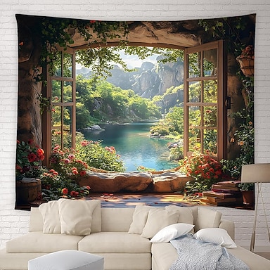 Bela paisagem natural fora da janela tapeçaria pendurada arte de parede grande tapeçaria mural decoração fotografia pano de fundo cobertor cortina casa quarto sala de estar decoração