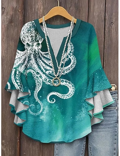 Mulheres Camisa Social Blusa Frufru Imprimir Gráfico Animal Férias Diário Retro Vintage Meia Manga Decote V Tops regulares Diário Feriado Para Noite Preto Verde Cinzento Verão Primavera Outono