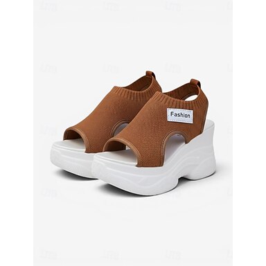 Sandálias femininas de plataforma em tricô marrom, sandálias esportivas respiráveis em tricô, calçado casual versátil para férias e caminhadas. &verão diário