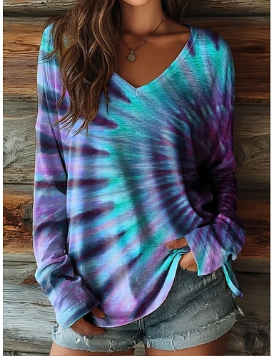 Mulheres Camiseta Imprimir Âmbar Gráfico Cores Gradiente Vintage à moda Clássico Manga Longa Decote V Tops regulares Diário Final de semana Azul Vermelho Verde Escuro Laranja Cinzento Verão Primavera