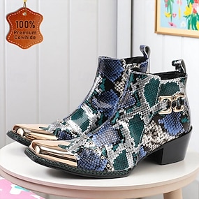 Ghete bărbătești cu vârful ascuțit din piele de șarpe albastră – ghete cu fermoar din piele de vacă rock star pentru concerte, festivaluri și ocazii tematice