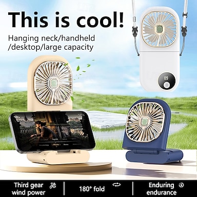 ventilator portabil de mână, ventilator pliabil pentru gât cu afișaj LED &Baterie externă, ventilator personal suspendat pentru călătorii, ventilator de birou pliabil la 180° cu suport pentru telefon,