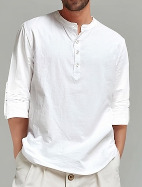 Bărbați Cămașă Cămașă de in Cămașă popover Cămașă de vară Costum de plajă Cămașă cu guler bandă Simplu Casual Zilnic Negru Alb Bleumarin Trifoi Manșon Lung Guler de stand Vară Primăvară Îmbrăcăminte