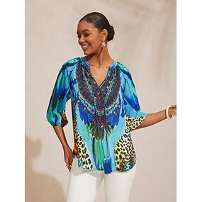 Bluză de damă albastră, cu imprimeu floral, guler cămașă, mânecă 3/4, boemă, casual, elegantă, vacanță, vară