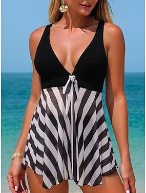 Pentru femei Costume de Baie Tankini 2 bucăți Slip Costum de baie Controlul abdomenului Talie Înaltă Zvelt Fără Spate Vacanță Costum de plajă Dungi În V Fără manșon Costume de baie