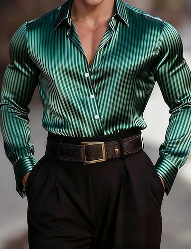 Bărbați Cămașă Mătase ca Cămașă din satin Cămașă casual Cămașă de bal Dunga Nuntă Petrecere Șampaniu Maro Trifoi Manșon Lung Rever Primăvară Toamnă Îmbrăcăminte