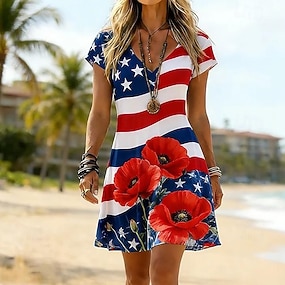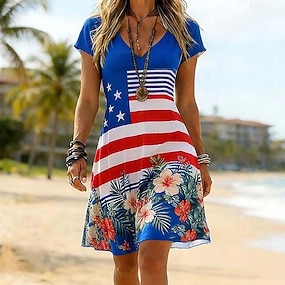 Ziua Independenței Americane Pentru femei Rochie Mini Rochie A line Vacanță Casual Plajă Fit regulat Grafic Steag Manșon scurt În V Negru Alb Vară Primăvară