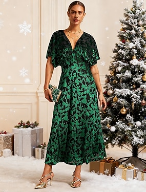 Pentru femei Rochie Maxi Rochie A line Elegant Petrecere Invitat la nunta Floral Frunză Manșon Jumate În V Verde Smarald