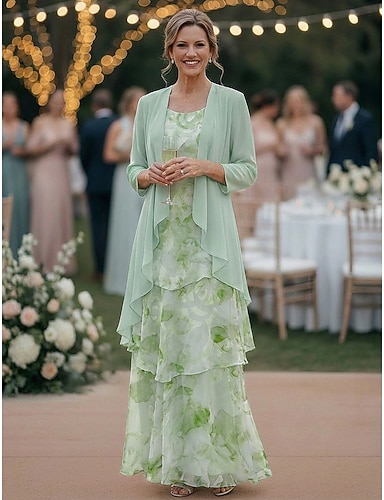 Două Piese Linia -A Lungime Podea Rochie pentru invitata de nunta Rochie Mama Miresei Fără manșon Lungime Manșon 3/4 Scoateți gâtul Elegant Simplu minimalist Oficial Semi formal Șifon Jaquard cu