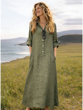 Pentru femei Rochie Maxi In din bumbac artificial Rochii Tip Cămașă Rochii de Caftan Rochie casual De Bază Casual Zilnic Vacanță Fit regulat Simplu Manșon Lung În V Roz Îmbujorat Trifoi Kaki Albastru