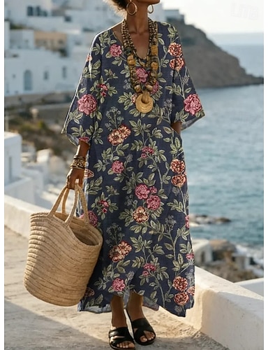 Pentru femei Rochie Maxi Rochie de Vară Rochie A line Vacanță Casual Boho Plajă Potrivire Largă Floral Grafic Lungime Manșon 3/4 În V Roz Îmbujorat Portocaliu Maro Trifoi Vară Primăvară