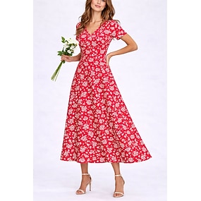 Pentru femei Rochii Midi Rochie A line Vacanță Casual În aer liber Ieșire Fit regulat Floral Manșon scurt În V Albastru piscină Negru Verde Deschis Roșu-aprins Vară Primăvară