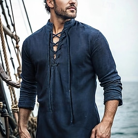 Bărbați Cămașă Cămașă de in Stilul Viking Cămașă de vară Cămașă de plajă Cămașă occidentală Culoare solidă Vacanță Casual Negru Alb Trifoi Manșon Lung În V Îmbrăcăminte Cordon