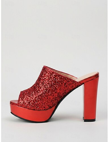 Sandale damă cu toc gros și platformă, roșii și strălucitoare – sandale slip-on cu toc bloc, pentru club de noapte, petrecere &seară glam în oraș