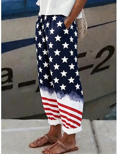 Pantaloni pentru femei patriote de Ziua Independenței pantaloni casual vacanță stil etnic vintage lungime completă talie înaltă pantaloni floral print cu steagul american cordon buzunare laterale