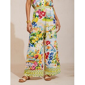 Pantaloni largi cu aspect de in, model Holiday Citrus Garden