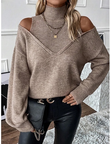 Pentru femei Pulover Casual Moale Culoare pură Striat Guler Pe Gât Tricotat Umăr rece Manșon Lung Topuri obișnuite Tricotat În aer liber Petrecere Zilnic Albastru piscină Negru Toamnă Iarnă