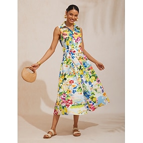 Rochie midi pentru femei din in rochie de vară rochie tip shift rochie în formă de A vacanță casual boho plajă petrecere ieșire potrivire lejeră grafic floral fără mâneci guler rotund alb verde