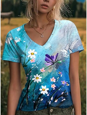 Pentru femei Tricou Imprimeu Floral Grafic Epocă Stilat Clasic Manșon scurt În V Topuri obișnuite Casual Zilnic Ieșire Albastru piscină Trifoi Vară Primăvară