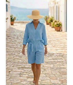 Pentru femei Cămașă Seturi de lenjerie de bumbac Seturi din două piese Pantaloni scurți de plajă Manșon scurt În V Culoare solidă Cordon Modă Șic Stradă Purtare Zilnică Dată Albastru piscină Kaki Gri