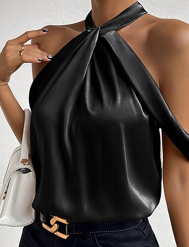 Pentru femei Cămașă Elegant Top din satin Bluză Zdrobit Decorat Culoare solidă Simplu Elegant Epocă Zilnic Fără manșon Gâtul halter Topuri obișnuite Zilnic Muncă Concediu Negru Vară Primăvară
