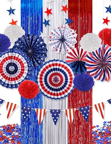 Set de decorațiuni pentru petrecerea de 4 iulie, 14 buc., evantai de hârtie roșii, alb-albastru, fanion cu steagul SUA, flori cu pompoane, perdele cu ciucuri din folie, panglică cu stea, articole