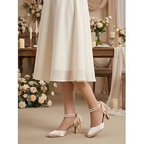 Pantofi de mireasă din satin cu toc jos pentru femei - tocuri elegante de culoarea șampaniei cu fundă din perle pentru miresele mai în vârstă la nunțile în oraș