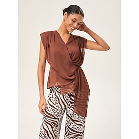 Top de damă, decolteu în V, asimetric, fără mâneci, șifon, căptușeală moale, pliuri inversate, tiv fluid, casual, elegant, primăvară-vară-toamnă